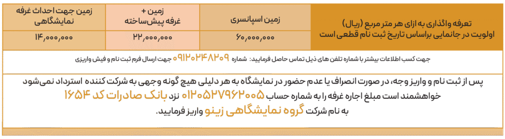 پیشثبتنام URLاین فیلد برای اعتبار سنجی است و باید بدون تغییر باقی بماند .شرکت | سازمان(ضروری) نام سازمان یا شرکت مدیر عامل | مدیر روابط عمومی زمینه فعالیت تلفن(ضروری)متراژ درخواستی (مترمربع)(ضروری)لطفاً یک مقدار از 30 تا 500 وارد نمایید.حامی میشویم برگه حامیان ملاحظه گرددوب سایت ایمیل تمایل داریم طراحی و ساخت غرفه توسط دپارتمان غرفه شرکت انجام شود. اطلاعات مورد تایید شرکت | سازمان میباشد(ضروری) خیر، تایید نمیشود بله، تایید میشود